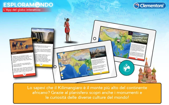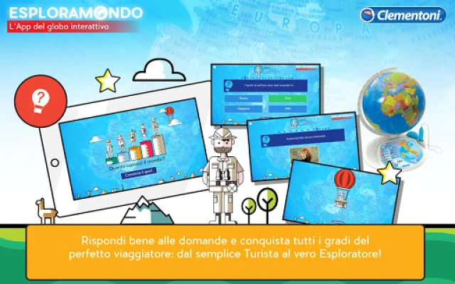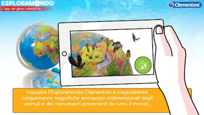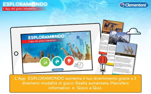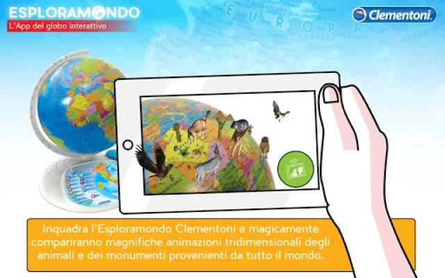„Esploramondo App" išplečia žaidimo ir tyrinėjimo galimybes, praturtindama mokymąsi su Clementoni Esploramondo. Skirta vaikams nuo 7 metų ir suaugusiems, ji siūlo papildytąją realybę su 3D gyvūnų ir paminklų animacijomis. Atraskite pasaulio žemėlapį su įdomiomis žiniomis ir viktorinas, lavinančias keliautojo įgūdžius.