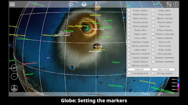 Naršykite Marso paviršių su GlobeViewer Marsas. Šis interaktyvus 3D gaublys rodo oficialius darinius, leidžia tyrinėti kraterius ir kalnus didelės raiškos vaizdais. Taip pat rasite išsamų Marso misijų žurnalą nuo 1960 m.