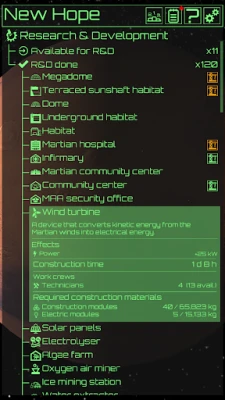 Šiame moksliškai orientuotame statybų ir simuliacijos žaidime, jūsų užduotis bus ne tik statyti, bet ir nuolat tobulėti. Pasirinkę vieną iš septynių unikalių Žemės organizacijų, turinčių savų pranašumų ir trūkumų, pradėsite savo kelionę. Gilinkitės į milžinišką technologijų medį, atrakindami daugiau nei 152 individualias technologijas. Statykite ir prižiūrėkite 51 skirtingą pastatą, tobulindami juos su 35 unikaliais patobulinimais. Siųskite ekspedicijas į Marsą, analizuokite dirvožemio mėginius ir atraskite paslaptis, kurios padės jūsų kolonijai augti.
