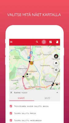 Tietorahdin kartta teikia svarbią žemėlapio informaciją sunkvežimių ir kitų didelių transporto priemonių vairuotojams. Gaukite atnaujintus duomenis apie aukščio apribojimus ir kitus svarbius kelio duomenis. Programa reguliariai atnaujinama. Siūlykite funkcijas susisiekę su Tietorahti.